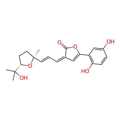 | InChI | InChI=1S/C21H24O6/c1-20(2,25)18-8-10-21(3,27-18)9-4-5-13-11-17(26-19(13)24)15-12-14(22)6-7-16(15)23/h4-7,9,11-12,18,22-23,25H,8,10H2,1-3H3/b9-4+,13-5-/t18-,21+/m0/s1 |