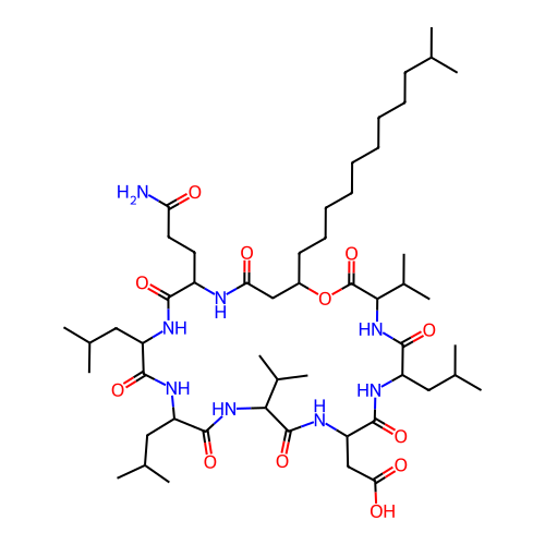 | SMILES | CC(C)CCCCCCCCCC1CC(=O)NC(C(=O)NC(C(=O)NC(C(=O)NC(C(=O)NC(C(=O)NC(C(=O)NC(C(=O)O1)C(C)C)CC(C)C)CC(=O)O)C(C)C)CC(C)C)CC(C)C)CCC(=O)N |
