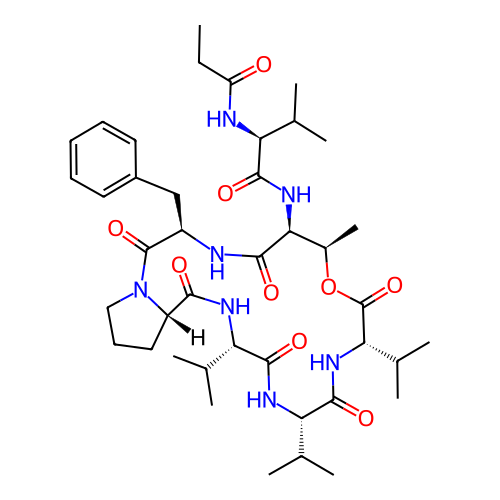 | SMILES | CCC(=O)N[C@@H](C(C)C)C(=O)N[C@H]1[C@H](OC(=O)[C@@H](NC(=O)[C@@H](NC(=O)[C@@H](NC(=O)[C@@H]2CCCN2C(=O)[C@H](NC1=O)CC3=CC=CC=C3)C(C)C)C(C)C)C(C)C)C |