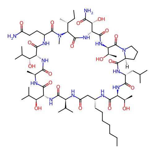 | SMILES | CCCCCCC[C@@H]1CC(=O)N[C@@H](C(C)C)C(=O)N[C@H]([C@@H](O)C(C)C)C(=O)N[C@@H](C)C(=O)N[C@H]([C@H](O)C(C)C)C(=O)NC(CCC(N)=O)C(=O)N(C)[C@@H]([C@H](C)CC)C(=O)N[C@H]([C@@H](O)C(N)=O)C(=O)N[C@H]([C@@H](C)O)C(=O)N2CCC[C@H]2C(=O)N[C@H](CC(C)C)C(=O)N[C@@H]([C@@H](C)O)C(=O)N1 |