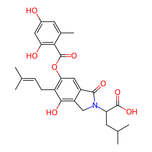 | SMILES | CC1=CC(=CC(=C1C(=O)OC2=C(C(=C3CN(C(=O)C3=C2)C(CC(C)C)C(=O)O)O)CC=C(C)C)O)O |