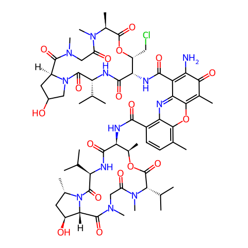 | SMILES | C[C@H]1C[C@@H]([C@@H]2N1C(=O)[C@H](NC(=O)[C@H]([C@H](OC(=O)[C@@H](N(C(=O)CN(C2=O)C)C)C(C)C)C)NC(=O)C3=C4C(=C(C=C3)C)OC5=C(C(=O)C(=C(C5=N4)C(=O)N[C@H]6[C@H](OC(=O)[C@@H](N(C(=O)CN(C(=O)[C@@H]7CC(CN7C(=O)[C@H](NC6=O)C(C)C)O)C)C)C)CCl)N)C)C(C)C)O |