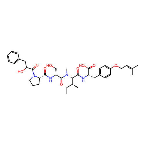 | SMILES | CC[C@H](C)[C@@H](C(=O)N[C@@H](CC1=CC=C(C=C1)OCC=C(C)C)C(=O)O)N(C)C(=O)[C@H](CO)NC(=O)[C@@H]2CCCN2C(=O)C(CC3=CC=CC=C3)O |