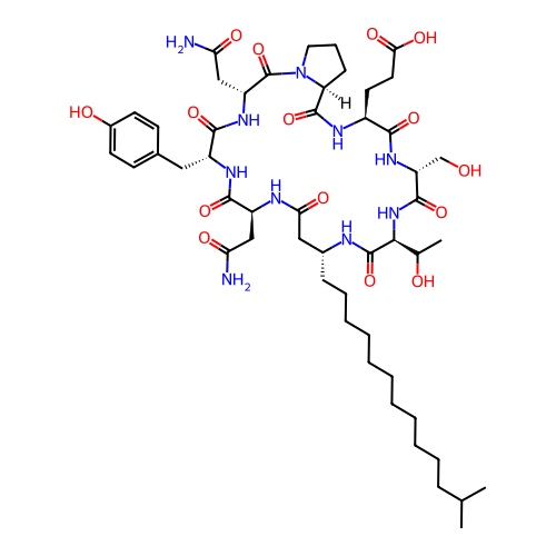 | SMILES | CC(C)CCCCCCCCCCC[C@@H]1CC(=O)N[C@H](C(=O)N[C@@H](C(=O)N[C@@H](C(=O)N2CCC[C@H]2C(=O)N[C@H](C(=O)N[C@@H](C(=O)N[C@H](C(=O)N1)C(C)O)CO)CCC(=O)O)CC(=O)N)CC3=CC=C(C=C3)O)CC(=O)N |
