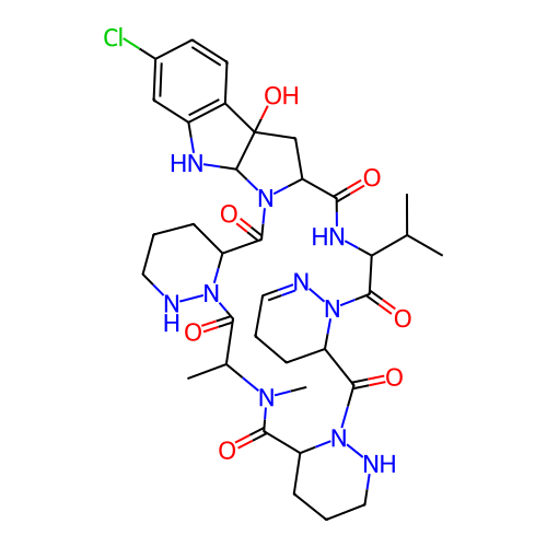 | InChI | InChI=1S/C35H47ClN10O7/c1-18(2)27-33(52)46-25(10-7-15-39-46)32(51)45-23(8-5-14-38-45)30(49)42(4)19(3)29(48)44-24(9-6-13-37-44)31(50)43-26(28(47)41-27)17-35(53)21-12-11-20(36)16-22(21)40-34(35)43/h11-12,15-16,18-19,23-27,34,37-38,40,53H,5-10,13-14,17H2,1-4H3,(H,41,47) |