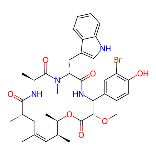 | SMILES | C[C@H]1C/C(=C\[C@@H]([C@H](OC(=O)[C@H](C(NC(=O)[C@H](N(C(=O)[C@@H](NC1=O)C)C)CC2=CNC3=CC=CC=C32)C4=CC(=C(C=C4)O)Br)OC)C)C)/C |