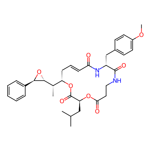 | InChI | InChI=1S/C34H42N2O8/c1-21(2)19-28-34(40)43-27(22(3)31-32(44-31)24-9-6-5-7-10-24)11-8-12-29(37)36-26(33(39)35-18-17-30(38)42-28)20-23-13-15-25(41-4)16-14-23/h5-10,12-16,21-22,26-28,31-32H,11,17-20H2,1-4H3,(H,35,39)(H,36,37)/b12-8+/t22-,26+,27-,28-,31+,32+/m0/s1 |