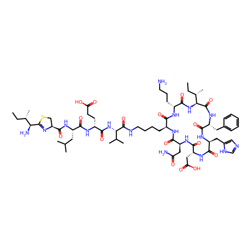 | SMILES | CC[C@H](C)[C@H]1C(=O)N[C@@H](C(=O)N[C@H](C(=O)N[C@@H](C(=O)N[C@H](C(=O)N[C@H](C(=O)N[C@@H](C(=O)N1)CCCN)CCCCNC(=O)[C@H](C(C)C)NC(=O)[C@@H](CCC(=O)O)NC(=O)[C@H](CC(C)C)NC(=O)[C@@H]2CSC(=N2)[C@H]([C@@H](C)CC)N)CC(=O)N)CC(=O)O)CC3=CN=CN3)CC4=CC=CC=C4 |