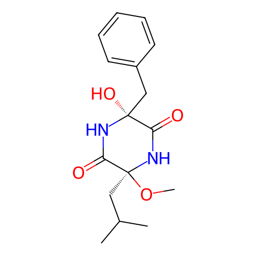 | SMILES | CC(C)C[C@@]1(C(=O)N[C@](C(=O)N1)(CC2=CC=CC=C2)O)OC |
