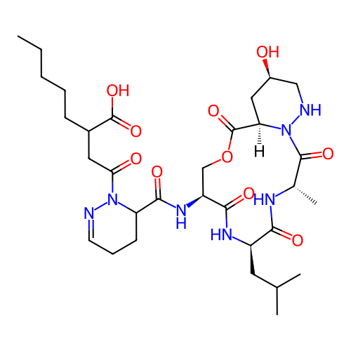 | SMILES | CCCCCC(CC(=O)N1C(CCC=N1)C(=O)N[C@H]2COC(=O)[C@H]3C[C@H](CNN3C(=O)[C@@H](NC(=O)[C@H](NC2=O)CC(C)C)C)O)C(=O)O |