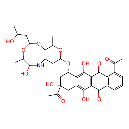 | SMILES | CC(=O)C1=CC=CC2=C1C(=O)C1=C(C2=O)C(O)=C2C[C@@](O)(C(C)=O)C[C@H](OC3CC4NC(O)C(C)OC(CC(C)O)OC4C(C)O3)C2=C1O |