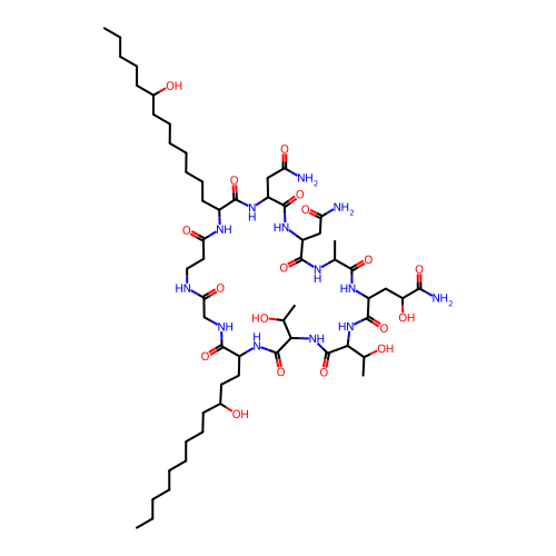 | SMILES | CCCCCCCCCC(CCC1C(=O)NCC(=O)NCCC(=O)NC(C(=O)NC(C(=O)NC(C(=O)NC(C(=O)NC(C(=O)NC(C(=O)NC(C(=O)N1)C(C)O)C(C)O)CC(C(=O)N)O)C)CC(=O)N)CC(=O)N)CCCCCCCC(CCCCC)O)O |