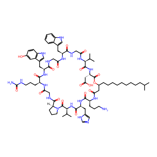 | SMILES | CC(C)CCCCCCCCCC1CC(=O)N[C@H](C(=O)N[C@H](C(=O)N[C@H](C(=O)N2CCC[C@H]2C(=O)NCC(=O)N[C@H](C(=O)N[C@H](C(=O)NCC(=O)N[C@H](C(=O)NCC(=O)N[C@H](C(=O)N[C@H](C(=O)O1)CC(=O)O)C(C)C)CC3=CNC4=CC=CC=C43)CC5=CNC6=C5C=C(C=C6)O)CCCNC(=O)N)C(C)C)CC7=CN=CN7)CCCN |