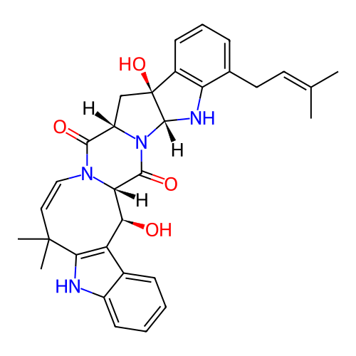 | InChI | InChI=1S/C32H34N4O4/c1-17(2)12-13-18-8-7-10-20-24(18)34-30-32(20,40)16-22-28(38)35-15-14-31(3,4)27-23(19-9-5-6-11-21(19)33-27)26(37)25(35)29(39)36(22)30/h5-12,14-15,22,25-26,30,33-34,37,40H,13,16H2,1-4H3/b15-14-/t22-,25-,26-,30+,32-/m0/s1 |