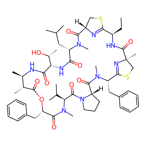 | SMILES | CC[C@@H]1C2=N[C@@H](CS2)C(=O)N([C@H](C(=O)N[C@H](C(=O)N[C@@H]([C@H](C(=O)O[C@H](C(=O)N([C@H](C(=O)N3CCC[C@H]3C(=O)N([C@H](C4=N[C@](CS4)(C(=O)N1)C)CC5=CC=CC=C5)C)C(C)C)C)CC6=CC=CC=C6)C)C)[C@@H](C)O)CC(C)C)C |