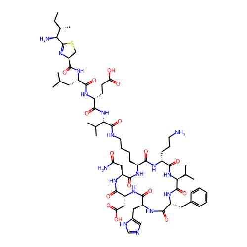 | SMILES | CC[C@H](C)[C@@H](C1=N[C@@H](CS1)C(=O)N[C@@H](CC(C)C)C(=O)N[C@H](CCC(=O)O)C(=O)N[C@@H](C(C)C)C(=O)NCCCC[C@H]2C(=O)N[C@@H](C(=O)N[C@H](C(=O)N[C@@H](C(=O)N[C@H](C(=O)N[C@@H](C(=O)N[C@H](C(=O)N2)CC(=O)N)CC(=O)O)CC3=CN=CN3)CC4=CC=CC=C4)C(C)C)CCCN)N |