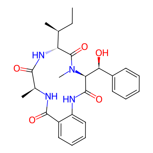 | SMILES | CC[C@H](C)[C@H]1NC(=O)[C@H](C)NC(=O)C2=CC=CC=C2NC(=O)[C@H]([C@@H](O)C2=CC=CC=C2)N(C)C1=O |