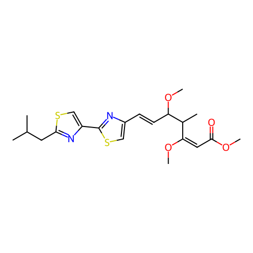 | InChI | InChI=1S/C21H28N2O4S2/c1-13(2)9-19-23-16(12-28-19)21-22-15(11-29-21)7-8-17(25-4)14(3)18(26-5)10-20(24)27-6/h7-8,10-14,17H,9H2,1-6H3/b8-7+,18-10+ |