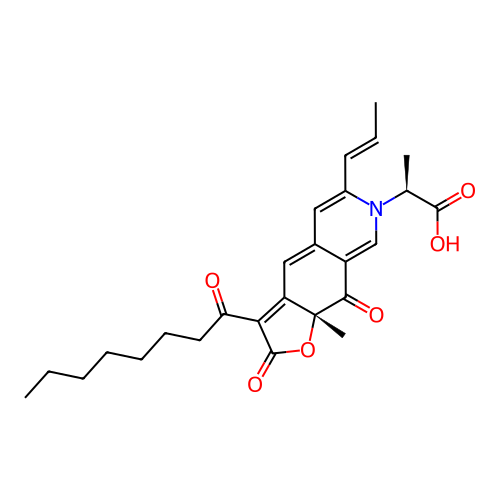 | InChI | InChI=1S/C26H31NO6/c1-5-7-8-9-10-12-21(28)22-20-14-17-13-18(11-6-2)27(16(3)24(30)31)15-19(17)23(29)26(20,4)33-25(22)32/h6,11,13-16H,5,7-10,12H2,1-4H3,(H,30,31)/b11-6+/t16-,26+/m0/s1 |