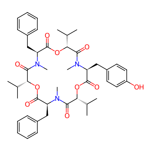 | SMILES | CC(C)[C@@H]1C(=O)N([C@H](C(=O)O[C@@H](C(=O)N([C@H](C(=O)O[C@@H](C(=O)N([C@H](C(=O)O1)CC2=CC=CC=C2)C)C(C)C)CC3=CC=C(C=C3)O)C)C(C)C)CC4=CC=CC=C4)C |