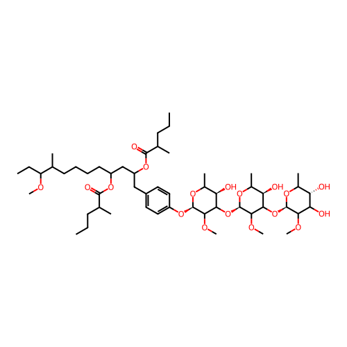 | SMILES | CCCC(C)C(=O)OC(CCCCC(C)C(CC)OC)CC(CC1=CC=C(C=C1)O[C@@H]2C(C([C@@H](C(O2)C)O)O[C@@H]3C(C([C@@H](C(O3)C)O)O[C@@H]4C(C([C@H](C(O4)C)O)O)OC)OC)OC)OC(=O)C(C)CCC |