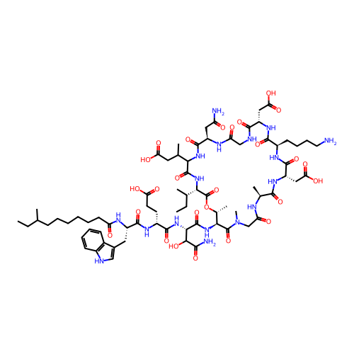 | SMILES | CCC(C)CCCCCCC(=O)N[C@@H](CC1=CNC2=C1C=CC=C2)C(=O)N[C@H](CCC(O)=O)C(=O)N[C@@H](C(O)C(N)=O)C(=O)N[C@H]1[C@@H](C)OC(=O)[C@@H](NC(=O)C(NC(=O)[C@@H](CC(N)=O)NC(=O)CNC(=O)[C@H](CC(O)=O)NC(=O)[C@@H](CCCCN)NC(=O)[C@H](CC(O)=O)NC(=O)[C@H](C)NC(=O)CN(C)C1=O)C(C)CC(O)=O)C(C)CC |