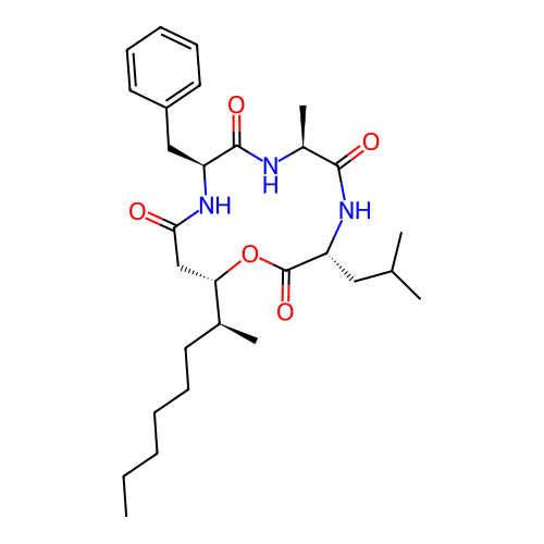 | SMILES | CCCCCC[C@H](C)[C@@H]1CC(=O)N[C@H](C(=O)N[C@H](C(=O)N[C@@H](C(=O)O1)CC(C)C)C)CC2=CC=CC=C2 |