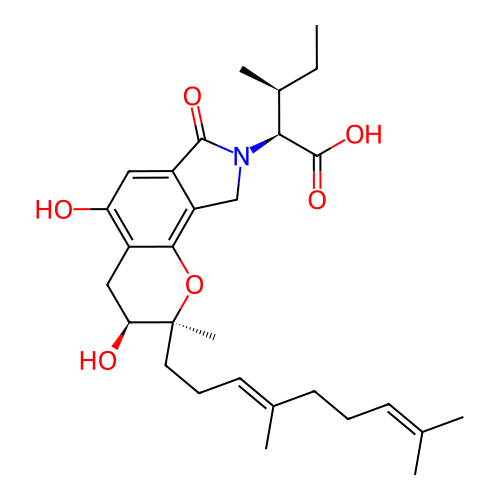| SMILES | CC[C@H](C)[C@@H](C(=O)O)N1CC2=C3C(=C(C=C2C1=O)O)C[C@@H]([C@](O3)(C)CCC=C(C)CCC=C(C)C)O |