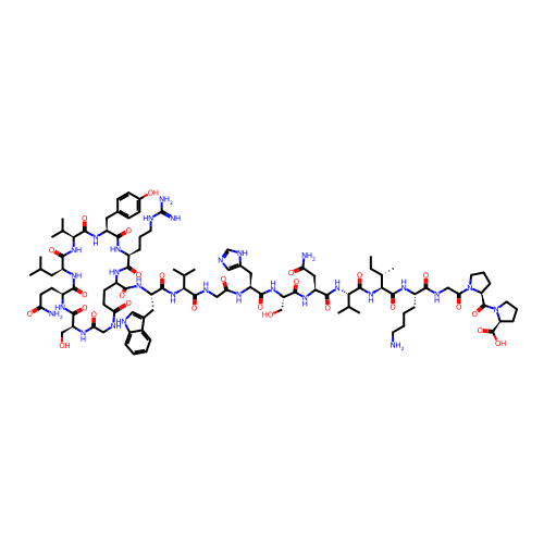 | SMILES | CC[C@H](C)[C@@H](C(=O)N[C@@H](CCCCN)C(=O)NCC(=O)N1CCC[C@H]1C(=O)N2CCC[C@H]2C(=O)O)NC(=O)[C@H](C(C)C)NC(=O)[C@H](CC(=O)N)NC(=O)[C@H](CO)NC(=O)[C@H](CC3=CN=CN3)NC(=O)CNC(=O)[C@H](C(C)C)NC(=O)[C@H](CC4=CNC5=CC=CC=C54)NC(=O)C6CCC(=O)NCC(=O)N[C@H](C(=O)N[C@H](C(=O)N[C@H](C(=O)N[C@H](C(=O)N[C@H](C(=O)N[C@H](C(=O)N6)CCCNC(=N)N)CC7=CC=C(C=C7)O)C(C)C)CC(C)C)CCC(=O)N)CO |