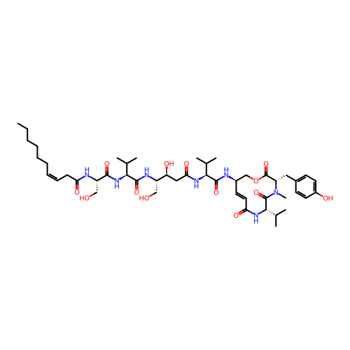 | SMILES | CCCCCC/C=C\CC(=O)N[C@@H](CO)C(=O)N[C@@H](C(C)C)C(=O)N[C@@H](CO)[C@H](CC(=O)N[C@@H](C(C)C)C(=O)N[C@H]1COC(=O)[C@@H](N(C(=O)[C@@H](NC(=O)C=C1)C(C)C)C)CC2=CC=C(C=C2)O)O |