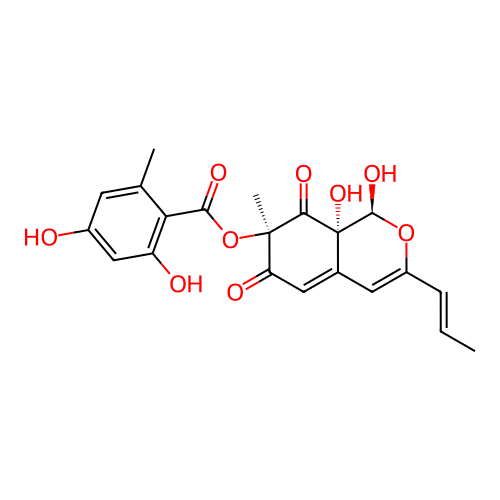 | InChI | InChI=1S/C21H20O9/c1-4-5-13-7-11-8-15(24)20(3,18(26)21(11,28)19(27)29-13)30-17(25)16-10(2)6-12(22)9-14(16)23/h4-9,19,22-23,27-28H,1-3H3/b5-4+/t19-,20+,21+/m0/s1 |