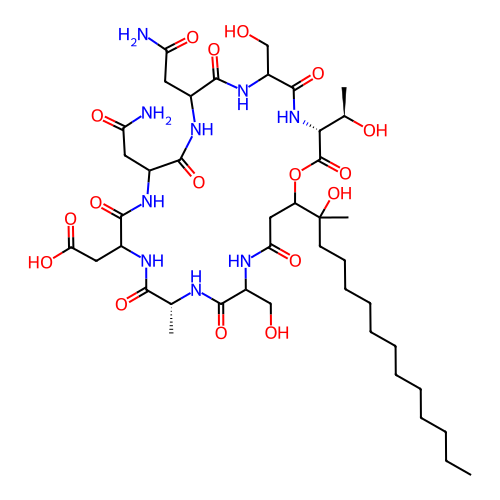 | SMILES | CCCCCCCCCCCCC(C)(C1CC(=O)NC(C(=O)N[C@@H](C(=O)NC(C(=O)NC(C(=O)NC(C(=O)NC(C(=O)N[C@@H](C(=O)O1)[C@@H](C)O)CO)CC(=O)N)CC(=O)N)CC(=O)O)C)CO)O |