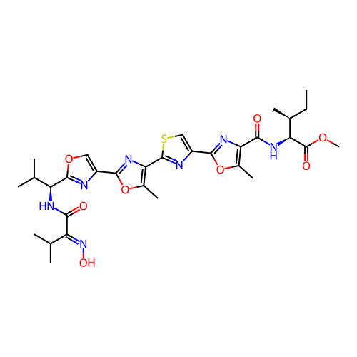 | SMILES | CC[C@H](C)[C@@H](C(=O)OC)NC(=O)C1=C(OC(=N1)C2=CSC(=N2)C3=C(OC(=N3)C4=COC(=N4)[C@H](C(C)C)NC(=O)/C(=N/O)/C(C)C)C)C |