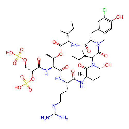 | SMILES | CCC(C)[C@H]1C(=O)O[C@@H]([C@@H](C(=O)N[C@H](C(=O)N[C@@H]2CC[C@H](N(C2=O)[C@H](C(=O)N([C@H](C(=O)N1)CC3=CC(=C(C=C3)O)Cl)C)C(C)CC)O)CCCN=C(N)N)NC(=O)[C@@H](COS(=O)(=O)O)OS(=O)(=O)O)C |