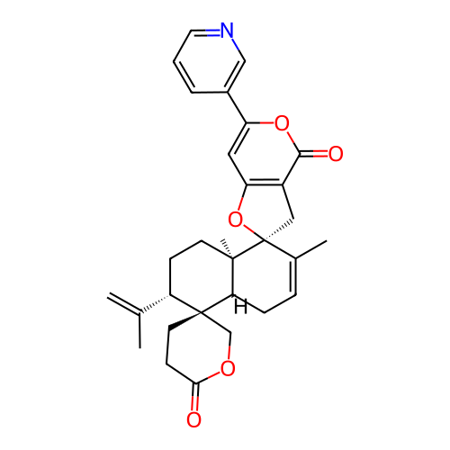 | InChI | InChI=1S/C30H33NO5/c1-18(2)22-9-11-28(4)25(29(22)12-10-26(32)34-17-29)8-7-19(3)30(28)15-21-24(36-30)14-23(35-27(21)33)20-6-5-13-31-16-20/h5-7,13-14,16,22,25H,1,8-12,15,17H2,2-4H3/t22-,25-,28+,29+,30-/m0/s1 |