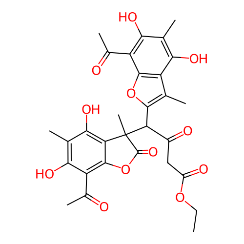 | NAME | ethyl 4-(7-acetyl-4,6-dihydroxy-3,5-dimethyl-2-oxo-2,3-dihydrobenzofuran-3-yl)-4-(7-acetyl-4,6-dihydroxy-3,5-dimethylbenzofuran-2-yl)-3-oxobutanoate |