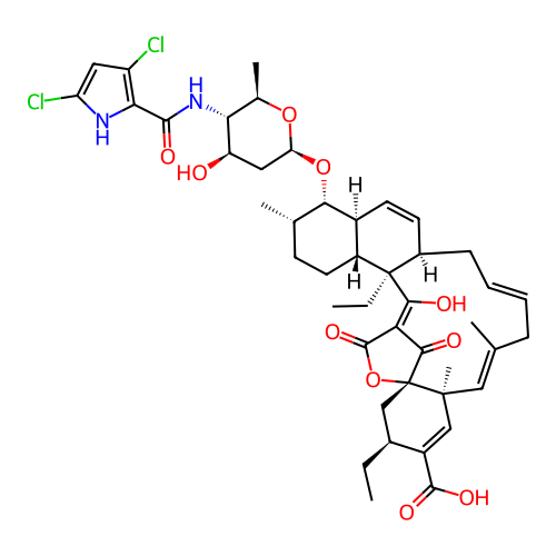 | SMILES | CC[C@H]1C[C@@]23C(=O)C(=C([C@]4([C@@H]5CC[C@@H]([C@@H]([C@H]5C=C[C@H]4C/C=C/C/C(=C/[C@]2(C=C1C(=O)O)C)/C)O[C@H]6C[C@H]([C@@H]([C@H](O6)C)NC(=O)C7=C(C=C(N7)Cl)Cl)O)C)CC)O)C(=O)O3 |