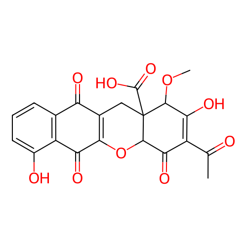 | InChI | InChI=1S/C21H16O10/c1-7(22)11-15(26)18(30-2)21(20(28)29)6-9-13(24)8-4-3-5-10(23)12(8)14(25)17(9)31-19(21)16(11)27/h3-5,18-19,23,26H,6H2,1-2H3,(H,28,29) |