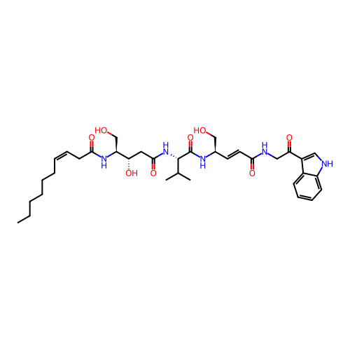| InChI | InChI=1S/C35H51N5O8/c1-4-5-6-7-8-9-10-15-32(46)39-28(22-42)29(43)18-33(47)40-34(23(2)3)35(48)38-24(21-41)16-17-31(45)37-20-30(44)26-19-36-27-14-12-11-13-25(26)27/h9-14,16-17,19,23-24,28-29,34,36,41-43H,4-8,15,18,20-22H2,1-3H3,(H,37,45)(H,38,48)(H,39,46)(H,40,47)/b10-9-,17-16+/t24-,28+,29+,34+/m1/s1 |