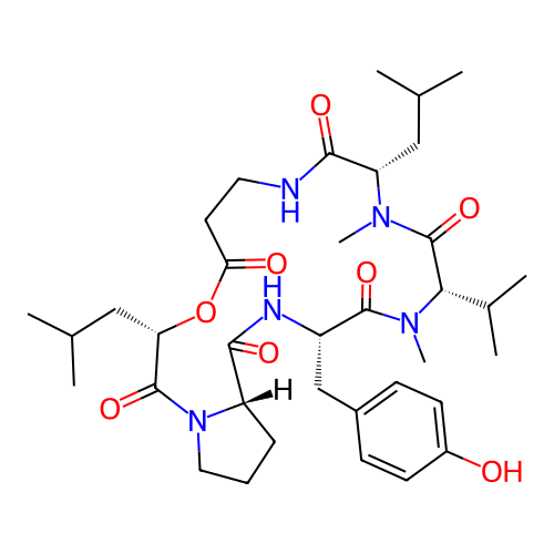| SMILES | CC(C)C[C@H]1C(=O)NCCC(=O)O[C@H](C(=O)N2CCC[C@H]2C(=O)N[C@H](C(=O)N([C@H](C(=O)N1C)C(C)C)C)CC3=CC=C(C=C3)O)CC(C)C |
