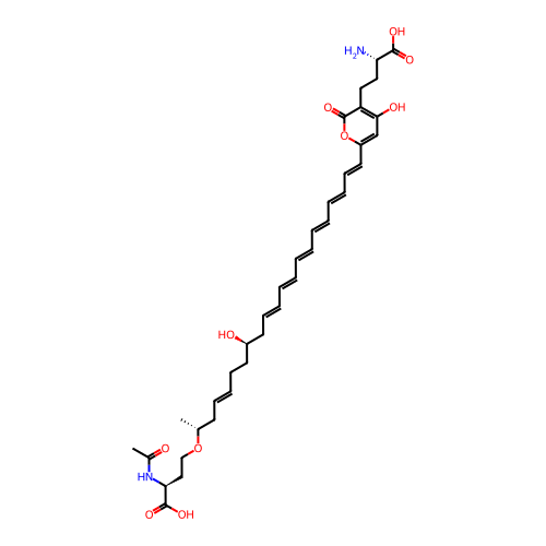 | SMILES | C[C@H](C/C=C/CC[C@H](C/C=C/C=C/C=C/C=C/C=C/C=C/C1=CC(=C(C(=O)O1)CC[C@@H](C(=O)O)N)O)O)OCC[C@@H](C(=O)O)NC(=O)C |