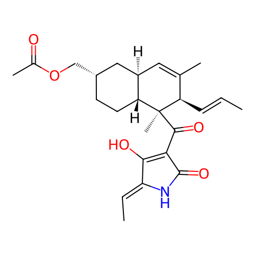 | InChI | InChI=1S/C25H33NO5/c1-6-8-18-14(3)11-17-12-16(13-31-15(4)27)9-10-19(17)25(18,5)23(29)21-22(28)20(7-2)26-24(21)30/h6-8,11,16-19,28H,9-10,12-13H2,1-5H3,(H,26,30)/b8-6+,20-7-/t16-,17+,18+,19+,25+/m0/s1 |