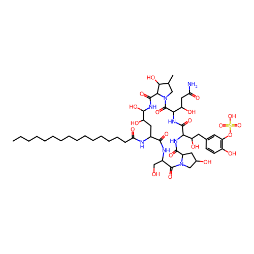 | SMILES | CCCCCCCCCCCCCCCC(=O)NC1CC(C(NC(=O)C2C(C(CN2C(=O)C(NC(=O)C(NC(=O)C3CC(CN3C(=O)C(NC1=O)CO)O)C(CC4=CC(=C(C=C4)O)OS(=O)(=O)O)O)C(CC(=O)N)O)C)O)O)O |