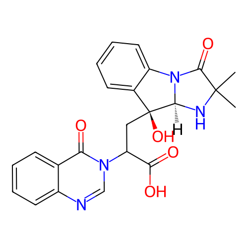 | InChI | InChI=1S/C23H22N4O5/c1-22(2)21(31)27-16-10-6-4-8-14(16)23(32,20(27)25-22)11-17(19(29)30)26-12-24-15-9-5-3-7-13(15)18(26)28/h3-10,12,17,20,25,32H,11H2,1-2H3,(H,29,30)/t17?,20-,23+/m1/s1 |