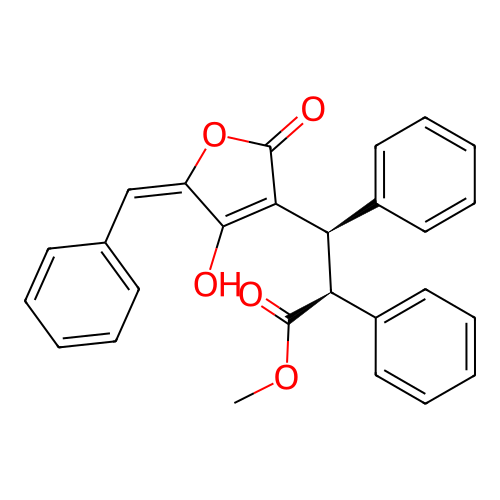 | InChI | InChI=1S/C27H22O5/c1-31-26(29)23(20-15-9-4-10-16-20)22(19-13-7-3-8-14-19)24-25(28)21(32-27(24)30)17-18-11-5-2-6-12-18/h2-17,22-23,28H,1H3/b21-17+/t22-,23+/m0/s1 |