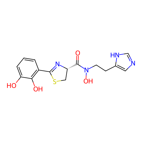 | SMILES | O=C([C@@H]1CSC(C2=C(O)C(O)=CC=C2)=N1)N(O)CCC1=CN=CN1 |