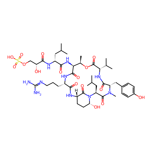 | SMILES | C[C@@H]1[C@@H](C(=O)N[C@H](C(=O)N[C@H]2CC[C@H](N(C2=O)[C@H](C(=O)N([C@H](C(=O)N[C@H](C(=O)O1)C(C)C)CC3=CC=C(C=C3)O)C)CC(C)C)O)CCCN=C(N)N)NC(=O)[C@@H](CC(C)C)NC(=O)[C@@H](COS(=O)(=O)O)O |