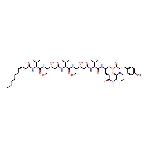 | InChI | InChI=1S/C55H88N8O15/c1-11-12-13-14-15-16-17-18-43(69)59-48(32(4)5)52(74)57-38(28-64)42(68)27-46(72)62-49(33(6)7)53(75)58-39(29-65)41(67)26-45(71)61-47(31(2)3)51(73)56-36-21-24-44(70)60-50(34(8)9)54(76)63(10)40(55(77)78-30-36)25-35-19-22-37(66)23-20-35/h16-17,19-24,31-34,36,38-42,47-50,64-68H,11-15,18,25-30H2,1-10H3,(H,56,73)(H,57,74)(H,58,75)(H,59,69)(H,60,70)(H,61,71)(H,62,72)/b17-16-,24-21?/t36-,38+,39+,40+,41+,42+,47+,48+,49+,50+/m1/s1 |