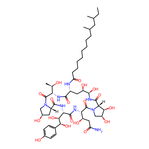 | SMILES | CCC(C)CC(C)CCCCCCCCC(=O)N[C@@H]1C[C@H]([C@H](NC(=O)[C@@H]2[C@H]([C@H](CN2C(=O)[C@@H](NC(=O)[C@@H](NC(=O)[C@@H]3C[C@H](CN3C(=O)[C@@H](NC1=O)[C@@H](C)O)O)[C@@H]([C@H](C4=CC=C(C=C4)O)O)O)[C@@H](CC(=O)N)O)O)O)O)O |