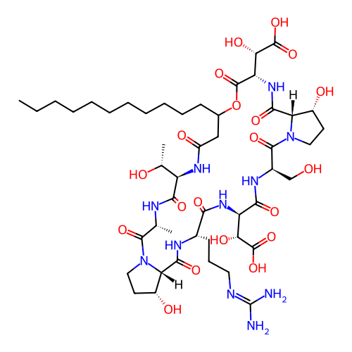 | SMILES | CCCCCCCCCCCC1CC(=O)N[C@H]([C@@H](C)O)C(=O)N[C@H](C)C(=O)N2CC[C@@H](O)[C@H]2C(=O)N[C@@H](CCCN=C(N)N)C(=O)N[C@H]([C@@H](O)C(=O)O)C(=O)N[C@H](CO)C(=O)N2CC[C@@H](O)[C@H]2C(=O)N[C@@H]([C@H](O)C(=O)O)C(=O)O1 |